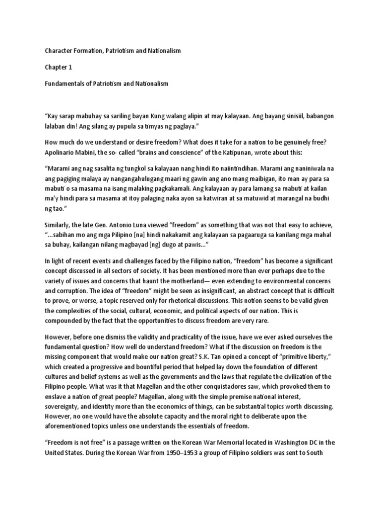 Ang kalayan ay maituturing na isang prebelehiyo dahil ito ang nagbibigay sa kaniyang pumili ng isang bagay. Aking mga kababayan huwag nating sayangin ang ipinaglaban ng ating mga bayani ang ating kalayaan at kasama sa kalayaang ito ay ang pagkakaroon ng ating Pambansang Wika at kalayaan na itoy ating magamit sa ating pamumuhay. Si Emilio Aguinaldo mismo ang lumikha sa itsura at kulay ng ating Pambansang Watawat sa tulong ni Marcela Agoncillo na nooy nasa Hongkong.